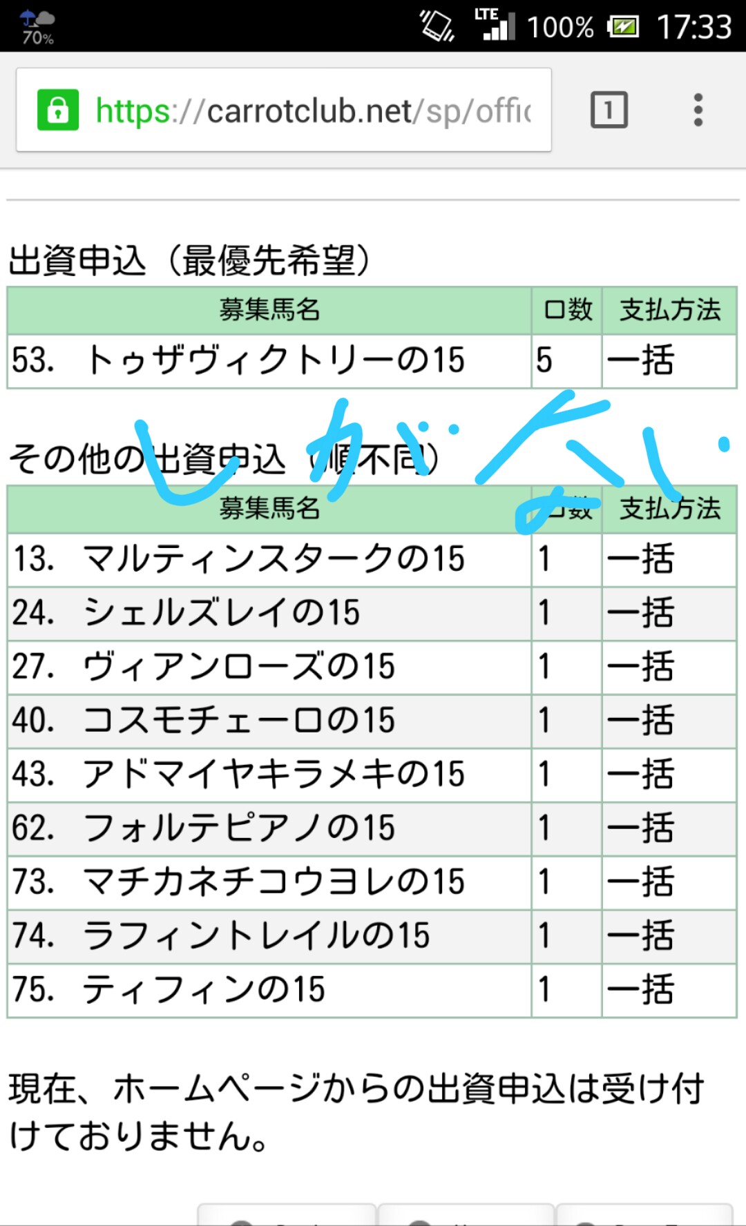 この度は2016年度1歳馬 第1次募集にお申込みいただきありがとうございました。